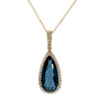 Pear shaped pendant with london blue topaz surrounded by diamonds.