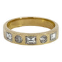Ring containing three baguette diamonds alternating with two round diamonds across the top of a flat polished band